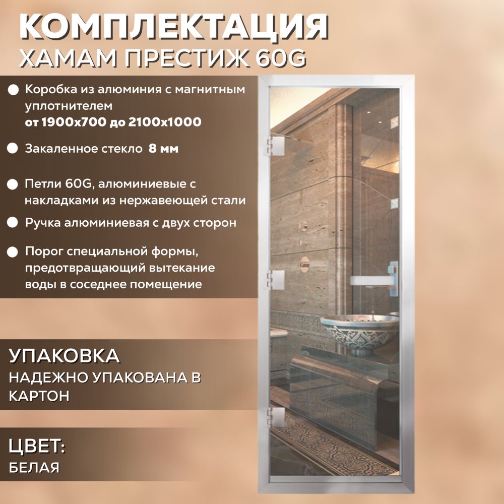 Дверь для хамама АРТА Престиж 60G 700мм х 1900мм, c порогом, прозрачная