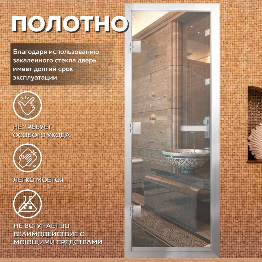 Двери Хамам — это отличное решение для помещений с повышенной влажностью (турецких парных, душевые, бассейнов), где пластик не выдерживает высокую температуру, а дерево разбухает и гниет от влаги.