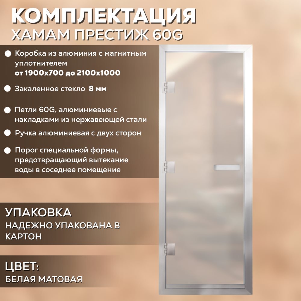 Дверь для хамама АРТА Престиж 60G 700мм х 1900мм, c порогом, белая матовая