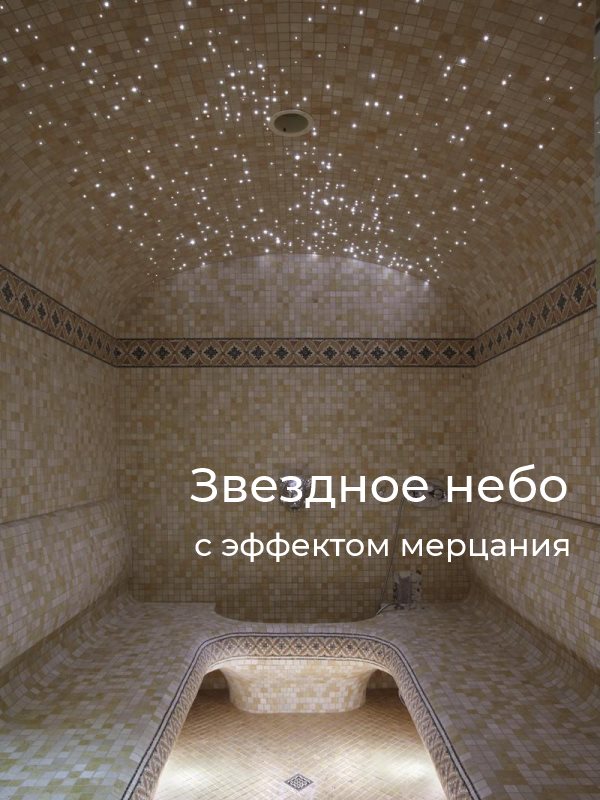 Теплый белый цвет свечения создает уютную и комфортную атмосферу в турецкой парной, а монохромный светодиодный источник света для оптоволоконных систем обеспечивает долговечность и экономичность.